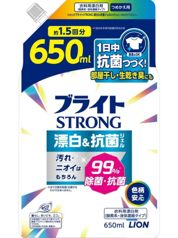 LION "Bright STRONG" Гель-отбеливатель кислородный "Супер яркость" 650 мл, мягкая упаковка с крышкой